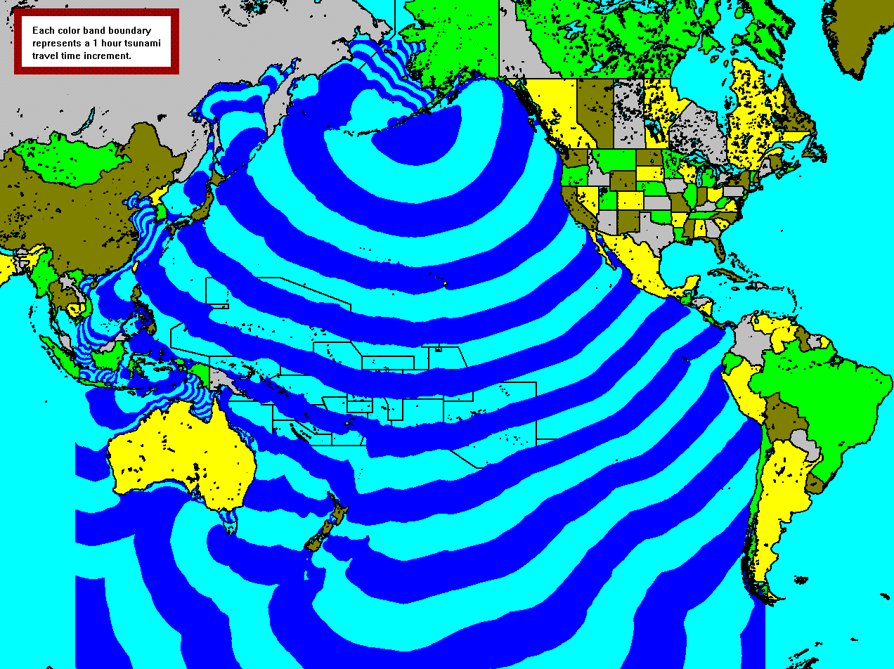 - NOAA Tsunami Research Program. Pacific Marine Environmental Laboratory, wave animation, wave travel charts, amplitude chart.
