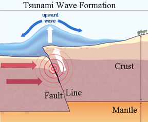What is a Tsunami? A tsunami is a sea wave, (more precisely, a series of waves), of local or distant origin that results from large-scale seafloor displacements associated with large earthquakes, major submarine slides, or exploding volcanic islands. A tsunami can be caused by a sudden vertical movement of a large area of the sea floor during an undersea earthquake and travels at speeds in excess of 450 mph. The first wave is almost never the largest and damaging waves may potentially arrive for hours. A tsunami is sometimes called a tidal wave, but this term is a misnomer. Unlike regular ocean tides, tsunamis are not caused by the tidal action of the moon and sun.